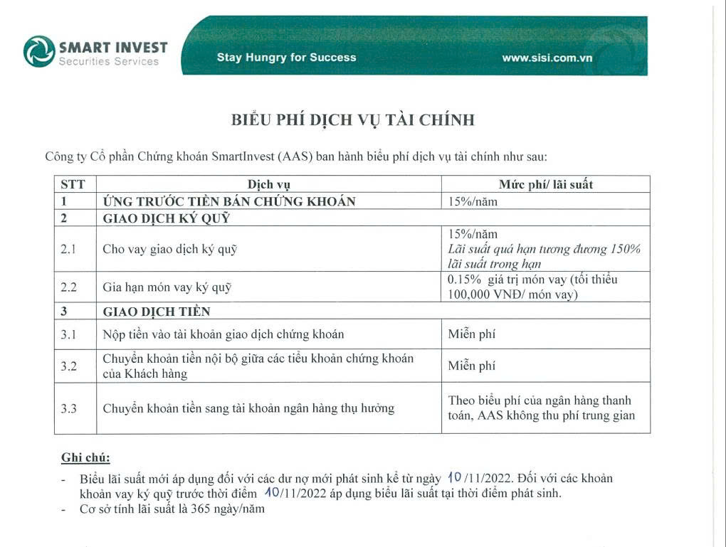 AAS THÔNG BÁO ĐIỀU CHỈNH LÃI SUẤT CHO VAY GIAO DỊCH KÝ QUỸ VÀ PHÍ ỨNG TRƯỚC TIỀN BÁN