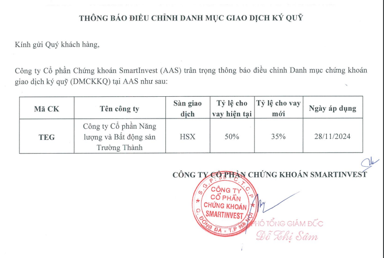 THÔNG BÁO ĐIỀU CHỈNH DANH MỤC GIAO DỊCH KÝ QUỸ